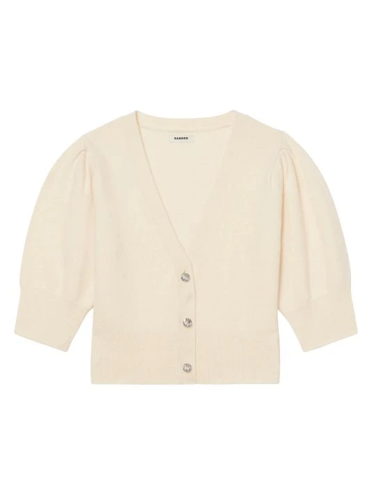 Designed with a blouson shape, this organic cotton cardigan features a metallic button front.