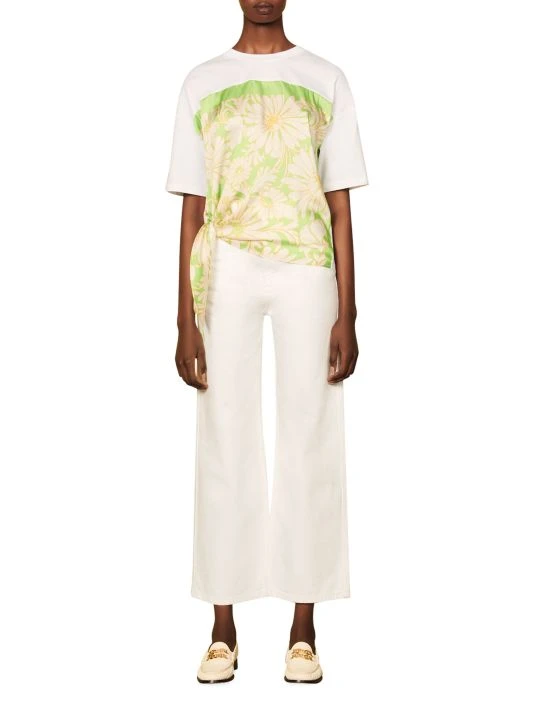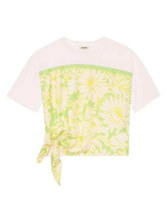Sandro’s Daisy top features a classic T-shirt silhouette elevated by a knotted scarf panel.
