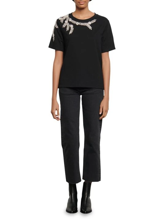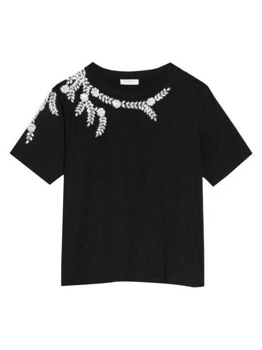 Short-sleeve cotton tee embellished with sparkling embroidery and rhinestone flowers.