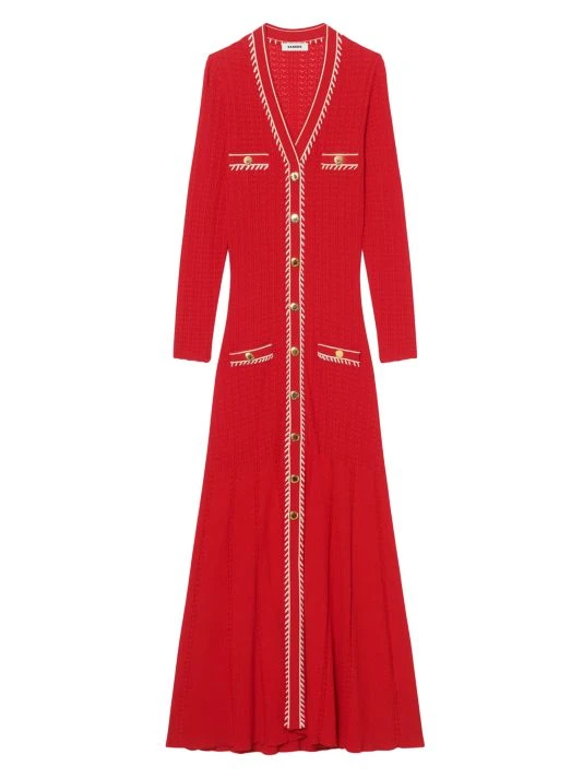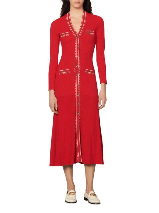 Contrast detailing adds dimension to this rib-knit midi dress, designed with lace-like trim.