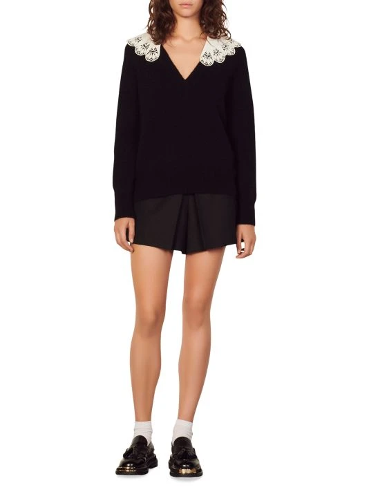 A contrast embroidered collar tops this fuzzy alpaca-blend sweater.