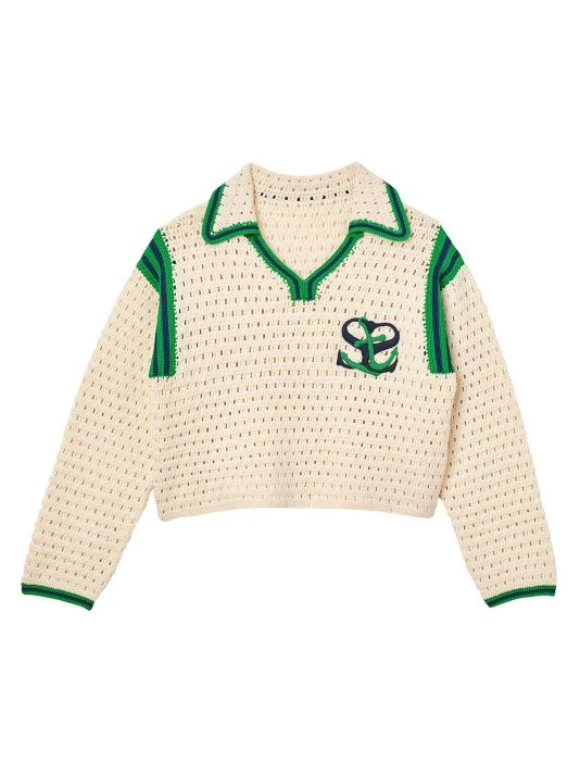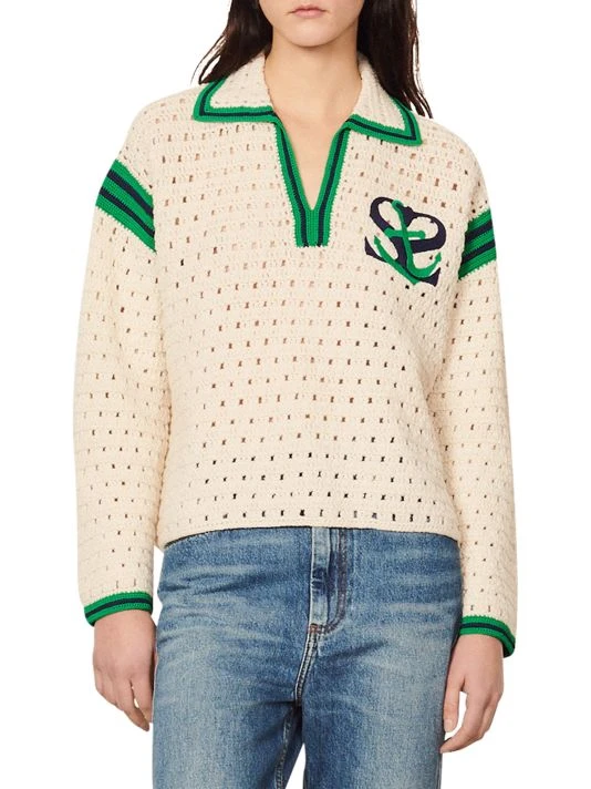 Crocheted from cozy wool, this polo sweater features contrast stripe trim and an embroidered logo at chest.