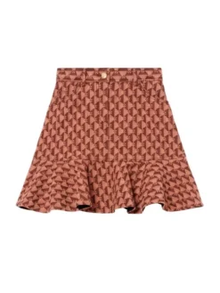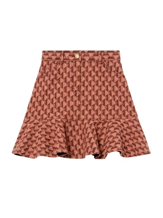 This denim mini-skirt features jacquard monogram patterning and a pleated flounce hem.