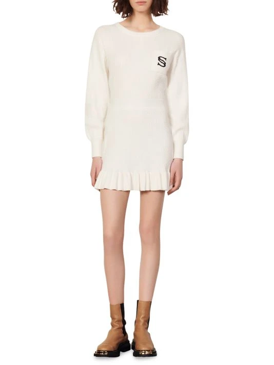 Cable patterning covers this knit mini skirt, designed with a ruffled hem.