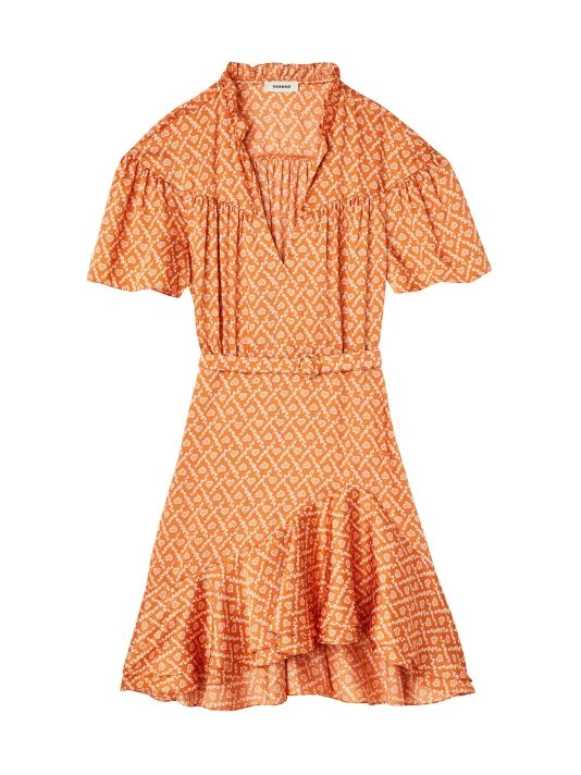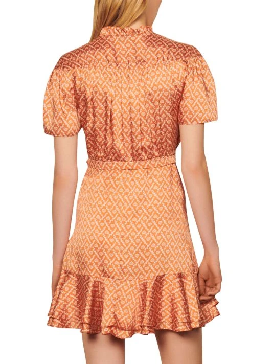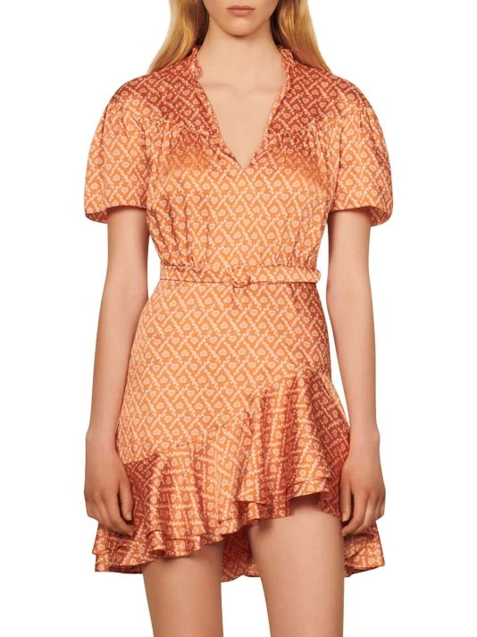 Tiny hearts cover Sandro’s Suzen mini dress, designed with asymmetric ruffled trim and a belt to define the waist.