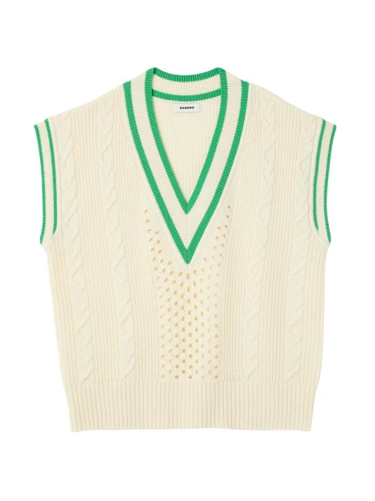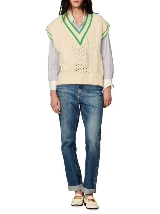 Designed with a preppy look, this cashmere-blend sweater vest features cable knit styling and bright striped trim.